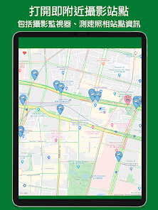 打開定位即實際地圖上繪製所在地中心附近的攝影機監視器、警廣路況、測速照相站點快速了解各地的路況並且可縮放地圖不再是小小的縮小圖快速了解各地的路況、附近旅遊景點說明(含獨立的夜市地圖)以及基本天氣資料。另外提供行車測速模式可播報行車沿路之測速照相站點以及攝影機。