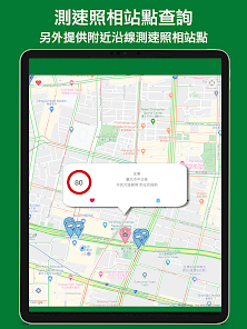 行車測速模式可播報行車沿路之測速照相站點以及攝影機。可開啟浮動視窗(子母畫面)搭配其他導航地圖 App 同時使用。