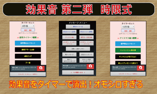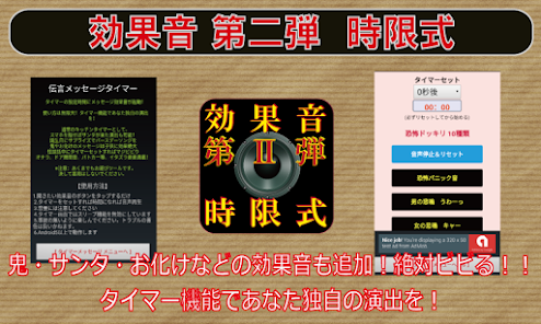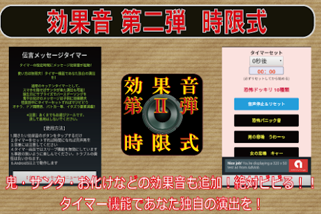 ジャンル別に用意された「効果音」や「伝言メッセージ」をタイマーの設定時間に再生するアプリです。