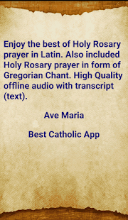 Enjoy the best from Holy Rosary prayer in Latin. Also included Holy Rosary in form of Gregorian Chant for better experience. All prayer are presented in quality offline audio with text (transcript).