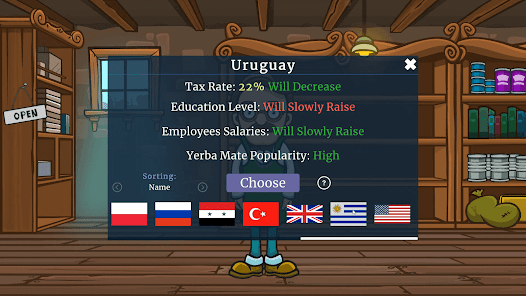 - Chose one country from 19 available in the game, set company and CEO stats. Countries got various tax rates, yerba popularity rate, workers salary, workers education, and change over time.