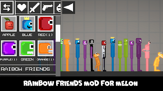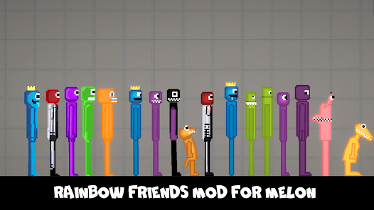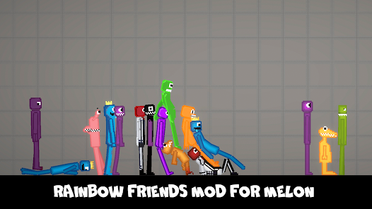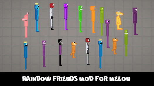 現在在甜瓜遊樂場的彩虹朋友們!在應用程序中,您可以找到大量適用於 Melon playground 的 Rainbow Friends Mods 合集。您將獲得這些角色:藍色、綠色、橙色、紫色、紅色、Purple Vent、Pink 以及更多模組。