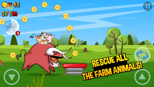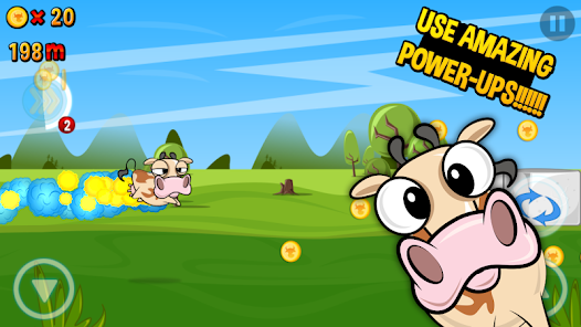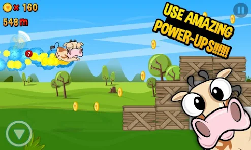 这是一款2D横版跑酷游戏玩家将帮助疯狂的奶牛跑得越远越好。一路上障碍重重还有农场主开着车在身后穷追不舍。游戏操作简单几个简单的按钮用于控制奶牛上窜下跳。连续点击跳跃键奶牛能蹦老高不过下落需要的时间也长需要酌情使用。