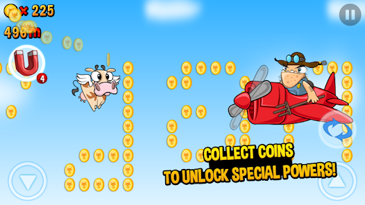 《奶牛快跑 Run Cow Run》中的超级奶牛不仅能在地上跑也能在天上飞一边收集金币一边躲过各种障碍。当有道具使用的时候奶牛可能会变成无敌状态还有可能召唤一只斗牛陪它一起横冲直撞。