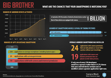 -- “Average android phone have installed 38 applications that have camera permission and can be anytime misused to watch you and spy on you. Each of 38 apps can take picture or recording video anytime they want. Most of the apps has internet permission and can transfer pictures and videos to the world. (Plus unknown number of security agencies watching your right now ;).” --