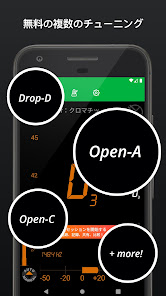最近的音符和八度音以巨大且易於閱讀的字體顯示,以赫茲為單位的頻率加上以美分為單位的誤差顯示在屏幕底部。靈敏度是自動調節的,但也可以通過屏幕左側的條形觸摸進行調節,算法的速度/精度和相對頻率可以通過配置菜單進行調節。