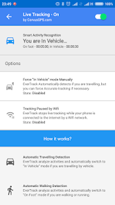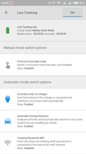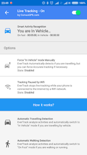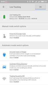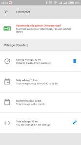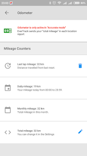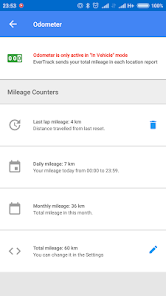 EverTrack automatically detects if you are In-Vehicle and calculate mileage. At the mileage counter (odometer) menu you can check your vehicle’s daily mileage, last trip mileage and total mileage too. EverTrack automatically tracks and calculate distances travelled by a vehicle. The mileage tracker feature is accurate, the difference is only about 1-5% compared to a car odometer. EverTrack is an accurate odometer for a car.