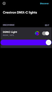 此應用程序用於控制 Crestron 燈具演示套件,這些套件通過 Android 設備上的藍牙使用 Lumenetix/ERP Araya LED 光引擎作為其當前燈具接口的完整代理。這個應用程序允許用戶改變光的顏色,以及強度。 Crestron 開發了一款應用程序,允許專業照明指定人員和設計師測試和採樣 DMX-C 藍牙以啟用演示裝置。