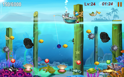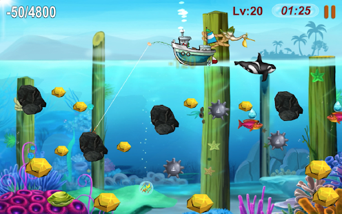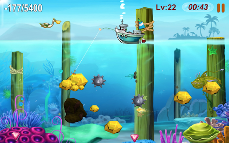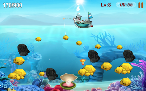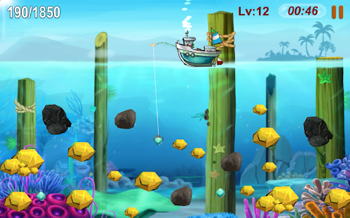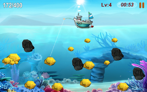 繼續玩淘金者很容易,只需觸摸屏幕就可以將鉤子擊中金色,鑽石在水中並將它們拖到船上。