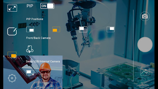 • With PIP you could capture stills or record videos from 2 cameras (one the connected USB camera and the other your device's front/rear camera). The output from your front/rear camera's location could be changed to any of the 4 corners.