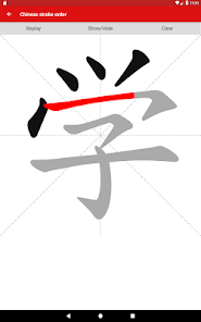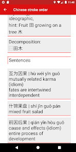 所有字符都帶有動畫,該動畫顯示了筆劃的順序。每個字符還帶有定義,拼音發音,詞源和多個句子。