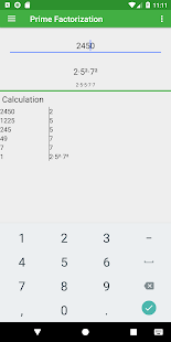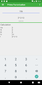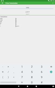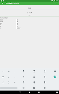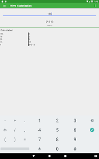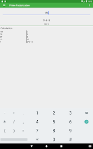 您可以使用此應用程序計算任何數字的所有素數因子。在輸入中輸入數字,將自動計算素數因子。該應用程序顯示所有因素分開(2·2·2·7)和權力(2³·7)。該應用程序還顯示所有分區步驟。