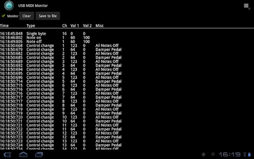 該USB MIDI顯示器讓您從您的USB MIDI接口所有傳入的MIDI事件。該事件是時間戳和事件類型,MIDI通道和值顯示在滾動表。為控制的變化,如果控制的變化是一個已知類型像體積或平移顯示額外的信息。