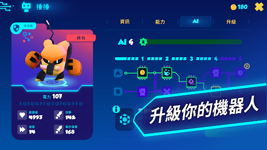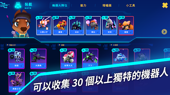 利用獨特策略戰勝敵人。結合先進 AI 技術及絕佳技能你的機器人在競技場上將以跳躍、重擊或投擲爆炸物等方式擊潰敵人。每個機器人都有其獨特技能和強大極限結合玩家的深厚實力可發揮最大效果。