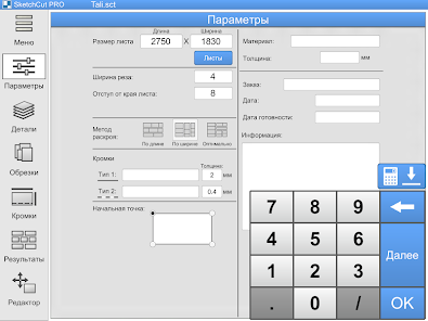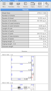 This app takes into account the specific characteristics of cutting sheet materials (laminates, MDF, plywood, glass, plastic, chipboard, etc.) either manually or on a cutting machine.