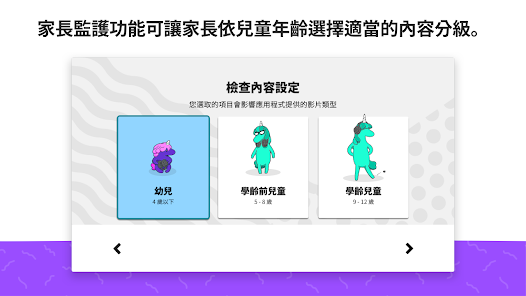 在我們的行動應用程式中你可以為每位孩子創造獨一無二的觀看體驗而相關設定也能沿用到電視版和網頁版的 YouTube Kids 服務。首先請在行動裝置或平板電腦上透過 iOS App Store 或 Google Play 商店下載 YouTube Kids然後登入帳戶並開始建立個人資料。每筆個人資料都能擁有獨立的觀看偏好、影片推薦及相關設定。接下來請選取適合子女的年齡類別包括 [幼兒] (4 歲以下)、[學齡前兒童] (5 至 8 歲) 或 [學齡兒童] (9 歲以上)或是選擇 [僅限已核准內容] 模式。