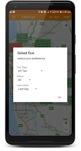 Using tool bar menus, you can filter taxis by Range, Taxi type and Status.