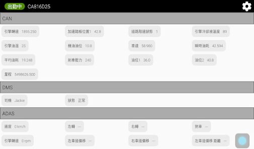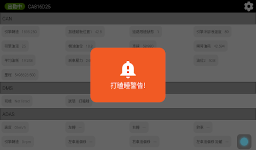 (2) 整合先進駕駛輔助系統(ADAS)、盲區偵測系統(BLIS)、駕駛生理偵測系統(DMS)、胎溫胎壓偵測系統(TMPS)、車況偵測系統(CAN),將駕駛行為發生的數據即時反應並回傳至雲端。透過直覺的儀表板顯示車輛狀態,若感測到任何異常狀態將即時觸發告警,達到即時有效的智慧駕駛輔助,有感提升出勤安全。