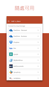 PowerPoint App 可讓您存取熟悉的工具。隨時隨地快速建立、編輯、檢視、發表簡報或快速且輕鬆地共用簡報。需要隨時隨地快速存取您最近使用的 PowerPoint 檔案嗎PowerPoint 可讓您快速檢視最近使用的檔案以便在任何裝置上輕鬆存取。使用 PowerPoint Mobile 時擔心檔案版本太多嗎同步處理功能可讓各個裝置無縫接軌。與任何人展開合作並且隨時隨地自信流利地向任何對象發表簡報。