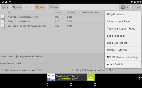 Switch Audio File Converter supports all popular formats and is very easy to use. With Switch for Android, you can convert or compress sound files in minutes. You can also use the batch conversion feature to convert several audio files at the same time. Typical applications for Switch Converter include sound for mobile devices, saving hard drive space, creating ringtones, and many more!