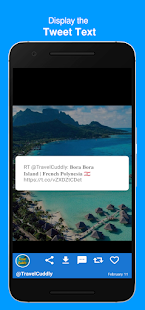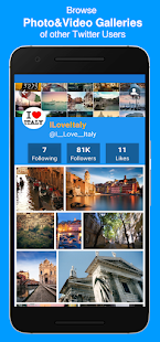 Log in with your Twitter account and explore photo and video tweets on Twitter. All photos and videos included in tweets can be downloaded to the smartphone or tablet. Downloaded photos and videos can be viewed even if network connectivity is not available and Twitter can't be accessed. After downloading a photo or a video from Twitter the corresponding media files can be displayed either inside the app or by any other video or photo app on the device. Animated Gif is supported too!