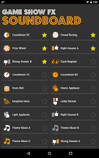 Game Show FX Soundboard brings the excitement of a high-production game show to your Android device. Sounds like prize wheels, dramatic countdowns, correct answer tones, and wrong answer buzzers are sure to intensify your event regardless of the consolation prize! Soundboard features include: