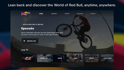 紅牛電視(Red Bull TV)有著高品質的點播及實時播放帶您超出平常水平這樣您可以發現來自引領潮流的藝術家的作品觀看來自世界各地的頂尖運動員的實時活動並跟著環球旅行冒險者們前往世界上最刺激的角落。