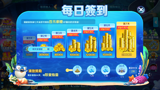 簽到就送,完成捕魚任務送,掛機也送,破產再送,金幣彈頭送不停!