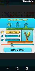 Do you enjoy word search puzzles? Then this is the application for you! All game boards are generated dynamically so you will never get the same board twice. Finish puzzles to earn stars and collect special alphabet characters. Earn bonus stars by playing the all new daily puzzle feature. A fun and comprehensive dictionary of words makes this game fun for players of all ages and skill levels.