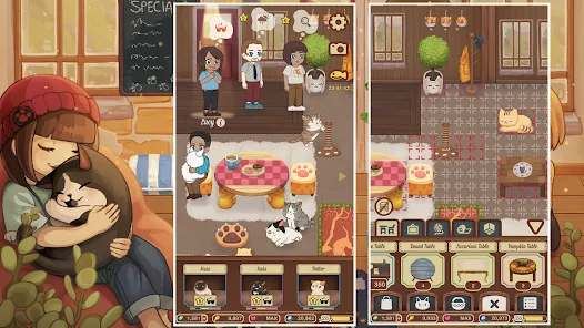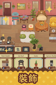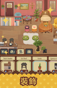 ● 自訂你的咖啡館從牆壁到地板整間咖啡館都可以自行改造。一切操之在你由你打造出自己專屬的空間。你想將咖啡廳改造成可愛貓咪樂園或是歌德風貓窩由你來決定