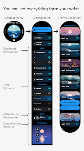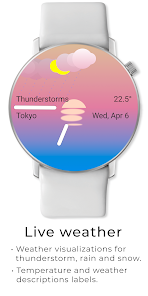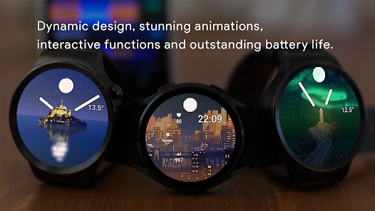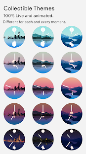 錶盤提供可更改的可收藏實時、動態和動畫主題。風景的主題在白天有一種環境氛圍,日落後往往會安靜下來,而城市景觀在黃昏後以數百萬種顏色點亮。