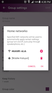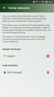 • 您可以配置“家庭”WiFi 網絡列表。 當您在此類網絡上時,該應用程序將自動應用自定義設置。 例如,這將允許僅在您實際在家時大聲播放傳入的消息。