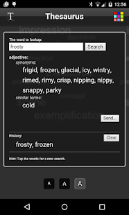 Retrieve the synonym for every word. If available you will get antonyms, related terms, similar word and user suggestions too. Tap one of the results to start a quick new search for that term. It keeps a history list of your search terms as well.