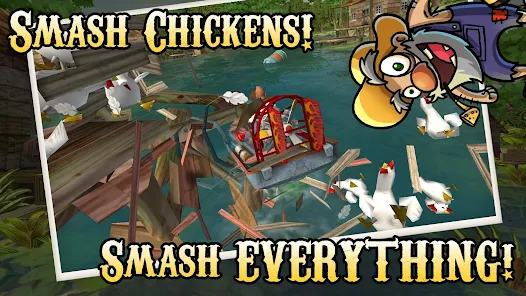 撞到堆滿桶的碼頭。拆除棚屋和外屋。平底船鱷魚和雞。如果你能看到它你可以粉碎它