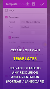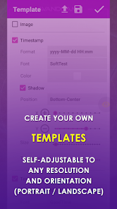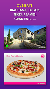 This camera app allows to customize templates with overlays and use them to print over the pictures. You can add timestamps, texts, images (e.g.: your company's logo) and design patterns such as color gradients, frames, bars, lines, vignete effects...