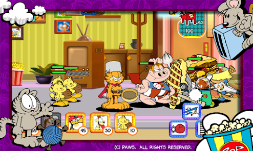 您要控制加菲貓,他的儲藏庫有著各種各樣的武器,包括叉子、卷著的報紙,以及一次可發射一打廉價塑料玩具車的發射裝置。加菲貓將漫畫中的人物都召喚來加入了防禦戰,包括憂傷的歐迪、尼莫爾、韋德、沃森、阿琳和喬恩