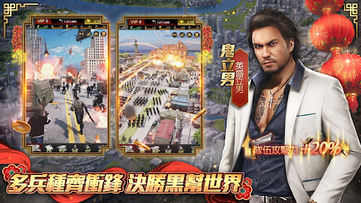升級別墅、加固陷阱、訓練暴徒、投資產業、磨練英雄、對抗仇敵、約會美女、秘密交易只有在您的英明率領下烏合之眾也能團結一致建立至高無上的黑道帝國