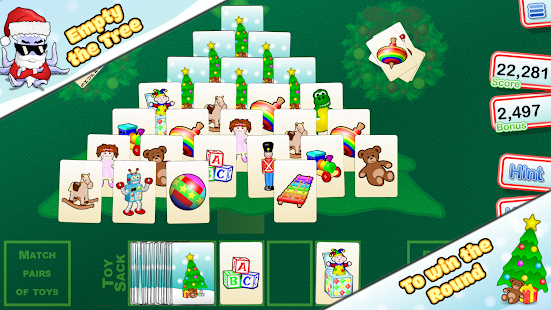 Get off to a festive start this holiday season by helping Santa sort out the presents in Christmas Tree Solitaire! Simply remove pairs of toys to empty the Christmas tree and win the round. Don't worry if you get stuck, Santa is on call to give you a helping hand!