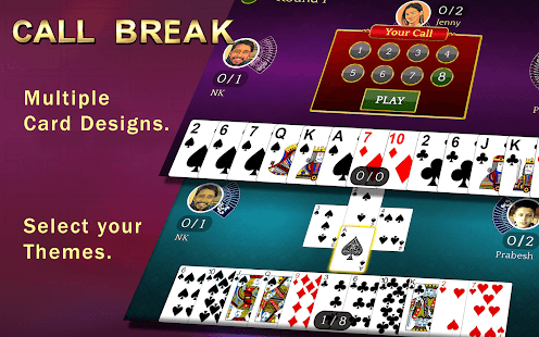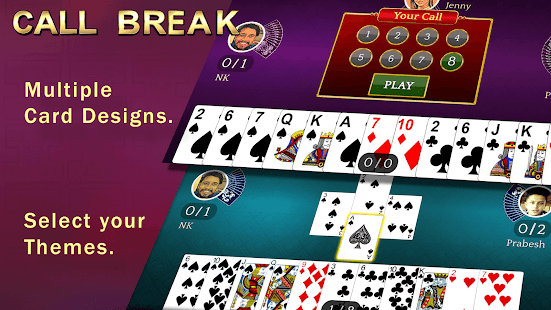 Call Break, also known as 'call brake' is a long-run game played with 52 cards deck between 4 players with 13 cards each. There are five rounds in this game, including 13 tricks in one round. For each deal, the player must play the same suit card. Spade is the default trump card. The player with the highest deals after five rounds will win.