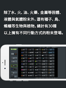 除了水、火、油、火藥、金屬等固體、液體與氣體粉末外還有種子、鳥、螞蟻等生物與植物總計有30種以上擁有不同行動方式的粉末登場。