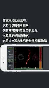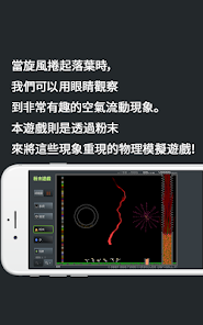 當旋風捲起落葉時我們可以用眼睛觀察到非常有趣的空氣流動現象。本遊戲則是透過粉末(dot圖)來將這些現象重現的物理模擬遊戲