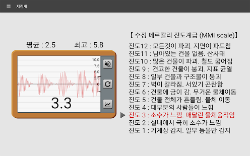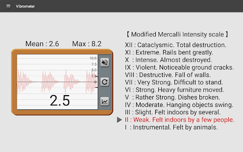 測量值是修改後的麥加利的強度規模(MMI),僅供參考。如不準確,您可以校準它令最大值大約是10-11。