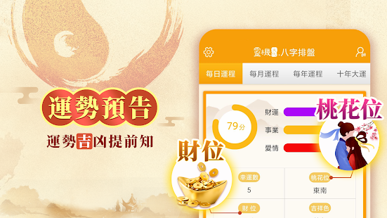 3,運程發展:免費查看每日運程,更有流年流月運勢查詢;十年大運直接預言你的大運流年變化!