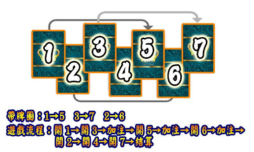 遊戲流程為:翻第一張牌→翻第三張牌→第一次加注→翻第五張牌→第二次加注→翻第六張牌→第三次加注→翻剩餘的牌→結算。