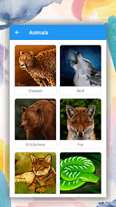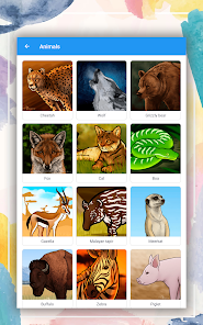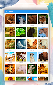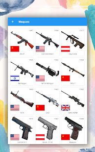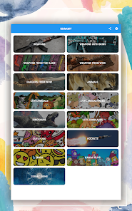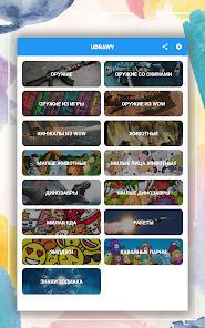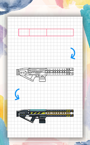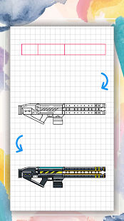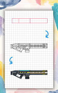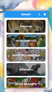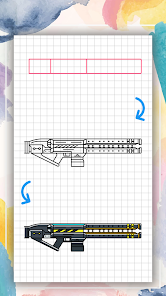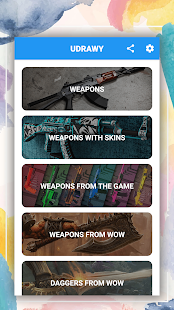 該應用程序包含大量的繪畫課程。所有這些都是按類別排列的。應用程序中呈現了武器、動物、恐龍、食物、可愛、卡哇伊圖畫、奇妙事物和許多其他類別。選擇你最喜歡的。品類中的借鑒數量不斷增加,質量不斷提高。手槍、手榴彈、狼、老虎、蛇、劍、斧頭等等都屬於這些類別。