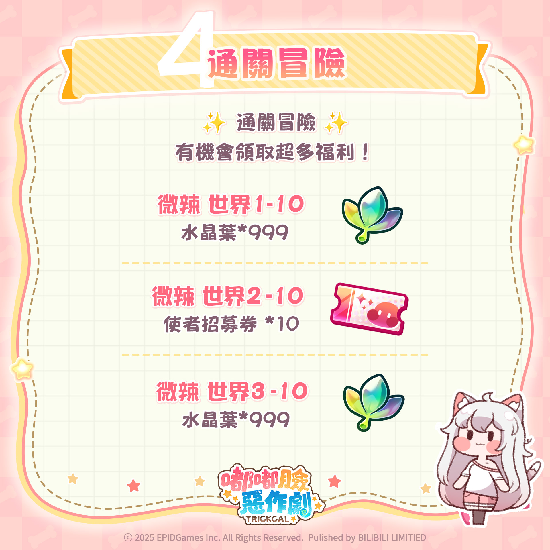 在福利方面,嘟嘟臉們給的禮物也毫不吝嗇,不僅可以直接無痛領取預約獎勵,更有多個開服限定獎勵、登入獎勵、新手獎勵、通關獎勵等等可以一直領一直爽。有請柯米為我們詳細說明一下有哪些福利吧!
