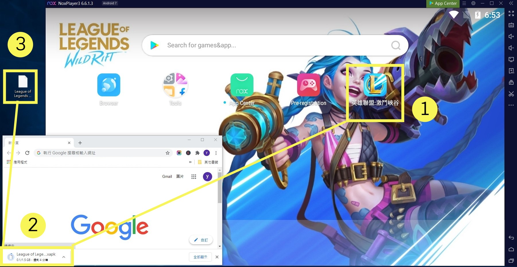 3.將下載的APK資源包“手動拖移”至夜神模擬器內,等待1分鐘安裝,即可看見「Wild Rift圖標」,且桌面也將生成對應啟動捷徑