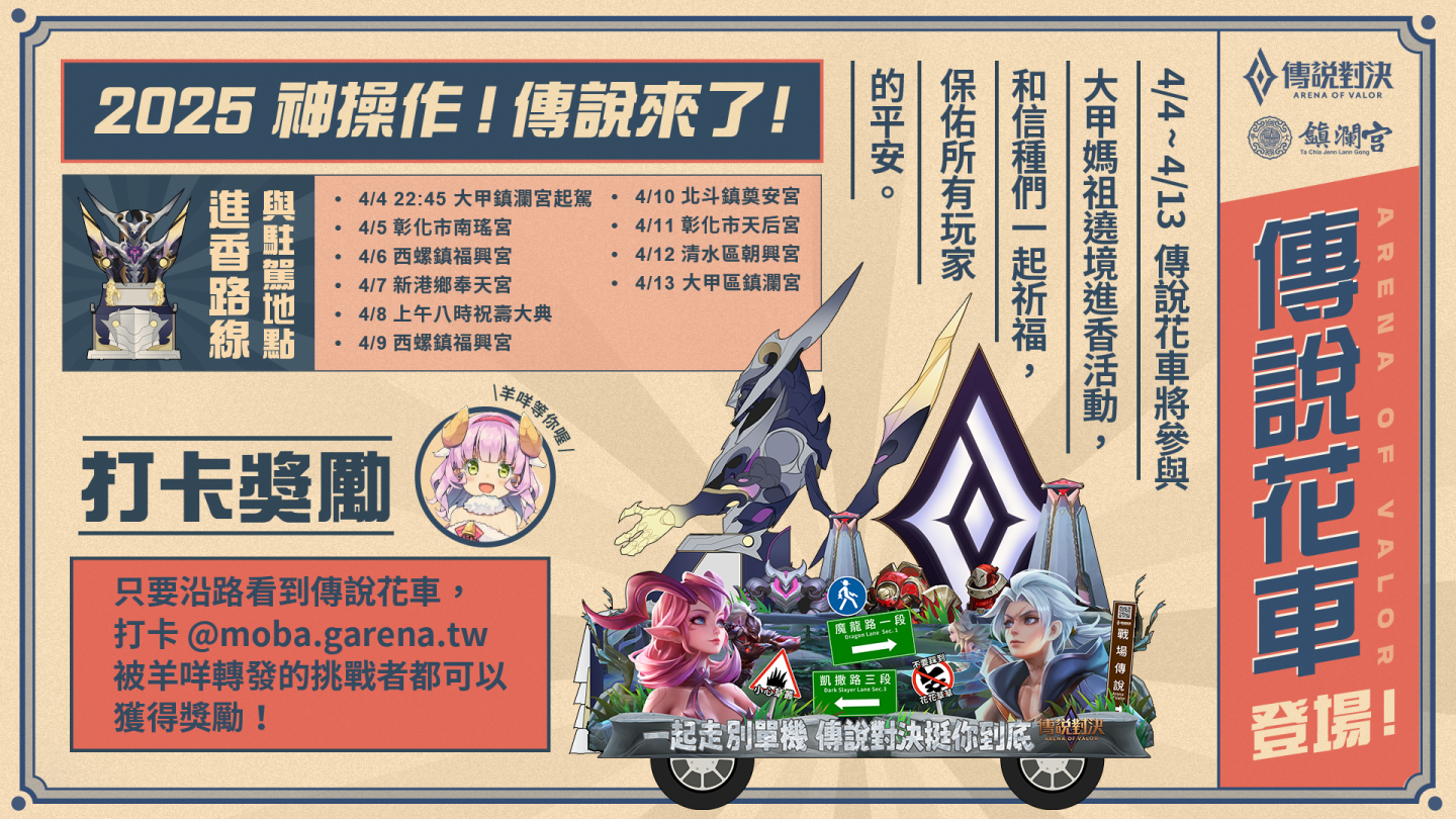 《Garena 傳說對決》首次參與台灣年度文化盛事「大甲媽祖遶境」,推出專屬主題花車,將經典戰場與人氣英雄實體化搬上街頭,不只在線上陪伴百萬玩家,也與百萬信眾一同虔誠前行。