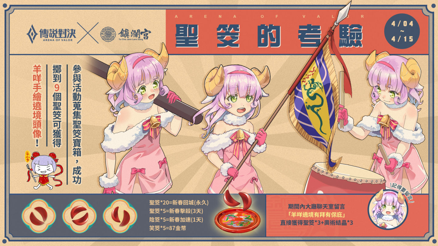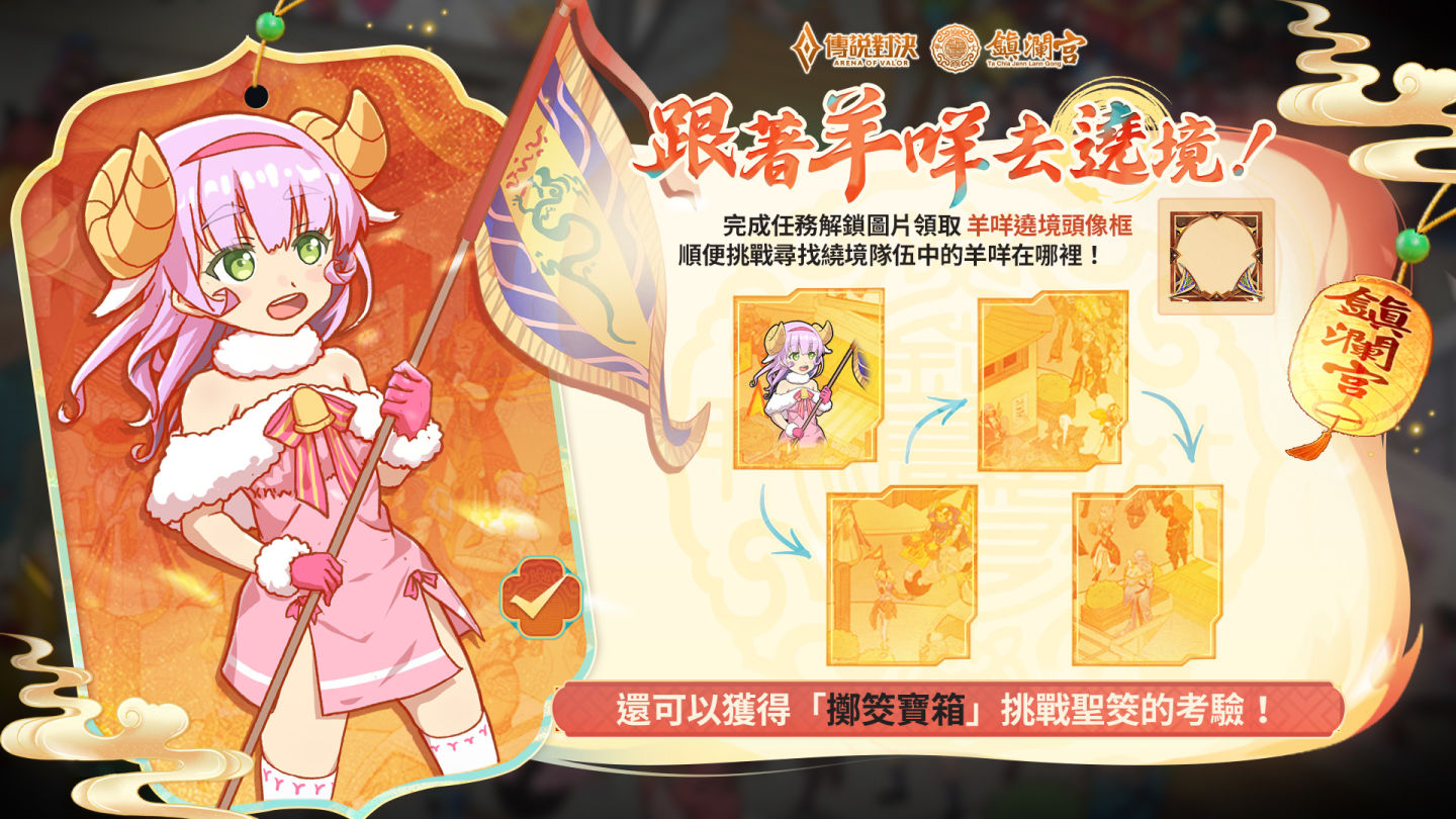 除此之外,《Garena 傳說對決》也在遊戲中推出「媽祖遶境遊戲活動」!只要登入遊戲並完成任務,即可免費獲得限量「羊咩遶境頭像框」!活動期間還能獲得特殊稱號「保庇」,祝福玩家在排位賽中一路順風、開心上分!