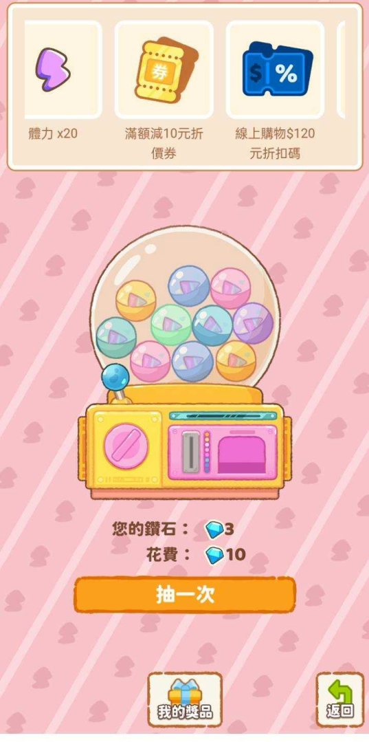 鑽石:最令人期待的用途就是參加「扭蛋抽獎」,堪稱驚喜百寶箱,獎項內容超級豐富。除了有助於遊戲進行的道具外,還可能抽到家樂福實體門市的各種優惠獎勵,例如商品優惠券、現金折價券、檔期活動的電子集點貼紙等。運氣爆棚的話,甚至有機會免費獲得 Menastyl 法蘭西鍋具組!玩得越多、完成訂單越多,能獲得的鑽石和抽獎機會也就越多。